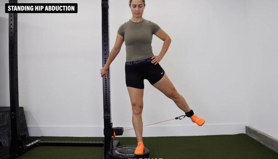 برای ابداکشن لگن در حالت ایستاده، میتوانید از یک باند یا کابل متصل به مچ پا استفاده کنید.