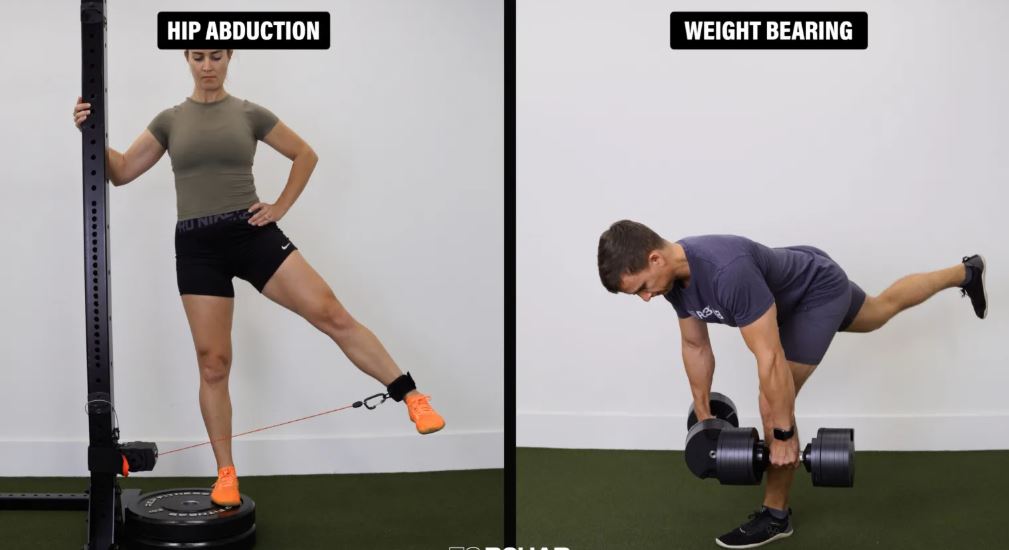 رایجترین تمرین بدون تحمل وزن، احتمالاً دور کردن مفصل ران از بدن به پهلو است که میتوان آن را روی زمین صاف یا روی نیمکت انجام داد تا دامنه حرکتی افزایش یابد.
