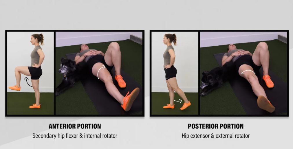 با خم شدن ۹۰ درجهای مفصل ران، تمام بخشها در چرخش داخلی مفصل ران مشارکت میکنند .