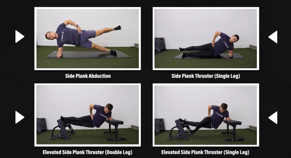 پلانک از پهلو فقط با وزن بدن انجام شد، در حالی که سایر تمرینات با استفاده از حداکثر ۱۲ تکرار انجام شد.