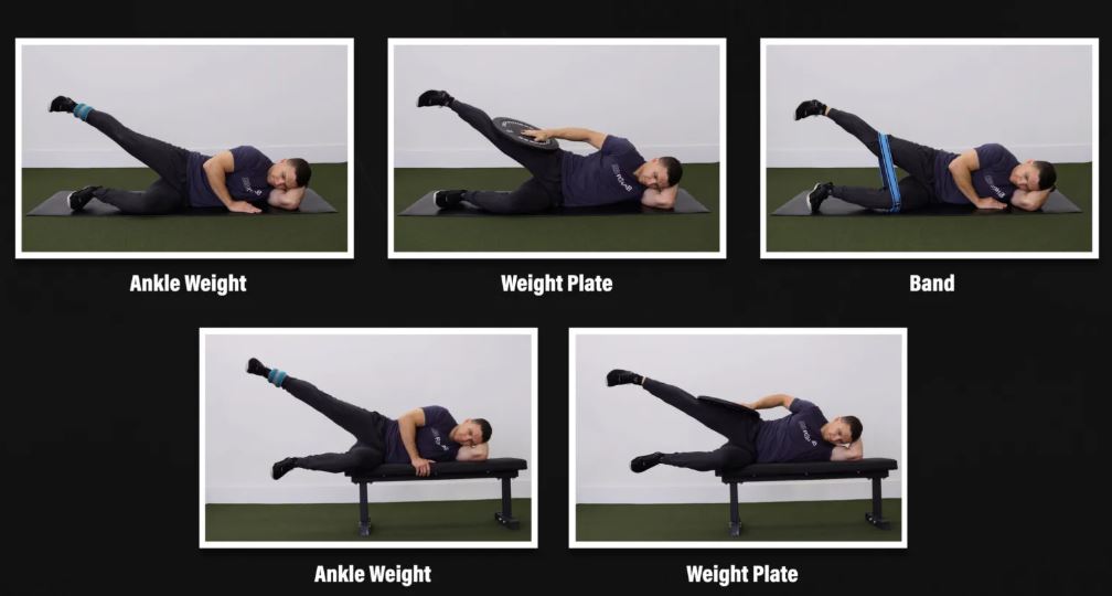 هر یک از این تمرینات را میتوان با هالتر، دمبل، کتلبل یا فقط با وزن بدن انجام داد. نگه داشتن وزنه در دست مخالف پای در حال تمرین میتواند راهکاری برای افزایش فشار بر عضله سرینی میانی باشد.