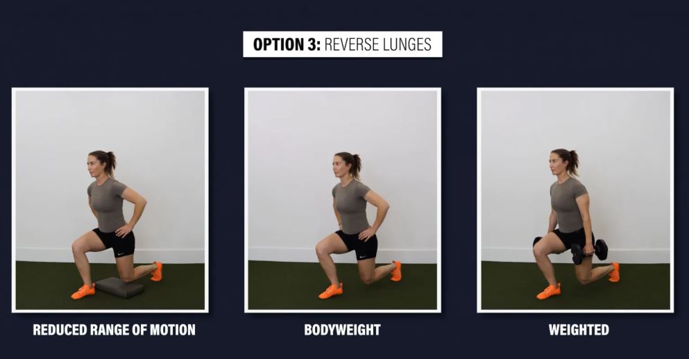 گزینه ۳: لانژ معکوس - میتوانید با کاهش دامنه حرکت و تماس زانوی عقبی با یک پد یا پله، این حرکت را آسانتر کنید. میتوانید با افزایش وزنه با دمبل، کتلبل یا هالتر، آن را دشوارتر کنید.