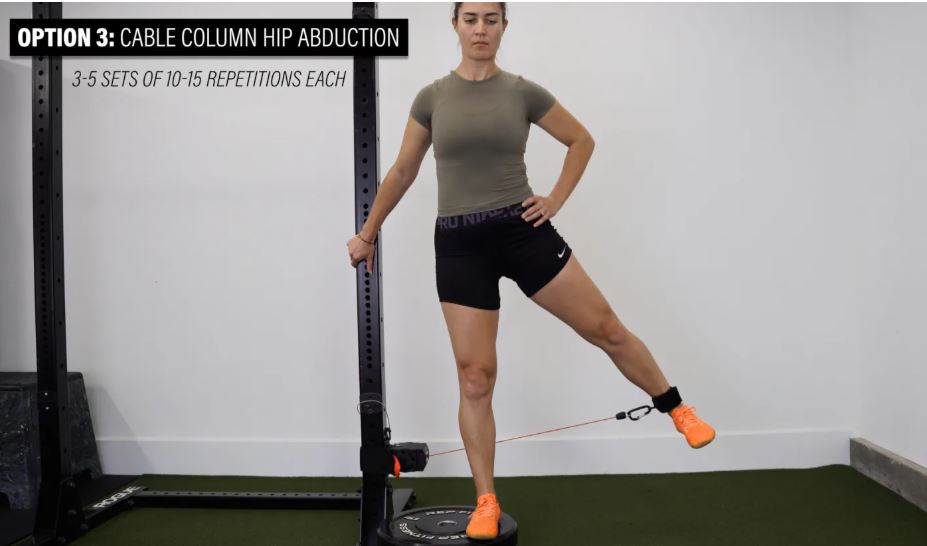 گزینه ۳: دور کردن لگن با کابل از ستون فقرات - در حالی که بند دور مچ پا قرار دارد، مستقیماً به پهلو و دور از بدن خود لگد بزنید. میتوانید با افزایش مقدار وزنه و افزایش حجم تکرارها و ستها، این حرکت را چالشبرانگیزتر کنید. سعی کنید این حرکت را به ۳ تا ۵ ست ۱۰ تا ۱۵ تکراری در هر طرف افزایش دهید.