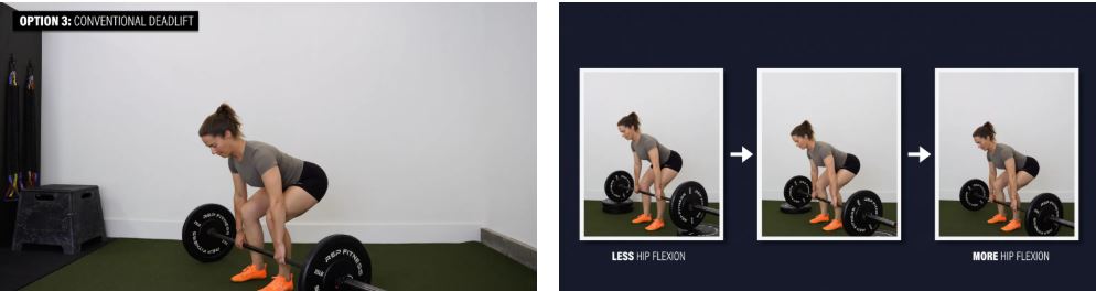 گزینه ۳: ددلیفت معمولی - کشیدن وزنه از روی زمین برای ددلیفت معمولی، میزان خم شدن لگن را افزایش میدهد. میتوانید با قرار دادن میله روی بلوکها، این حرکت را آسانتر و میزان خم شدن لگن را کاهش دهید. میتوانید با افزایش میزان وزنه و/یا تعداد تکرارها و ستهایی که انجام میدهید، آنها را دشوارتر کنید.