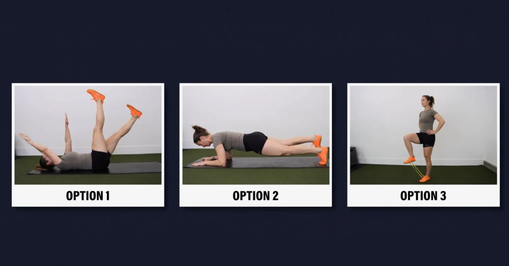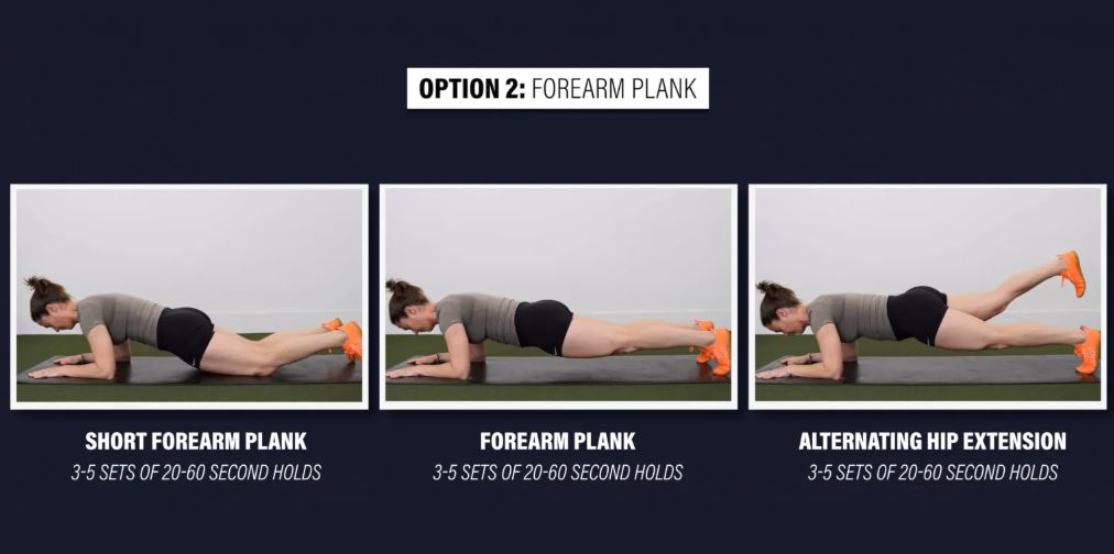 گزینه ۲: پلانک ساعد - در حالت پلانک روی ساعدهای خود شروع کنید و از پشت سر تا دنبالچه یک خط مستقیم تشکیل دهید. اگر این حرکت خیلی دشوار است، روی زانوهای خود پایین بیایید. اگر خیلی آسان است، میتوانید کشش متناوب مفصل ران را به آرامی و کنترل شده انجام دهید تا چالش روی پای پایین افزایش یابد. تا ۳-۵ ست ۲۰-۶۰ ثانیهای ادامه دهید.