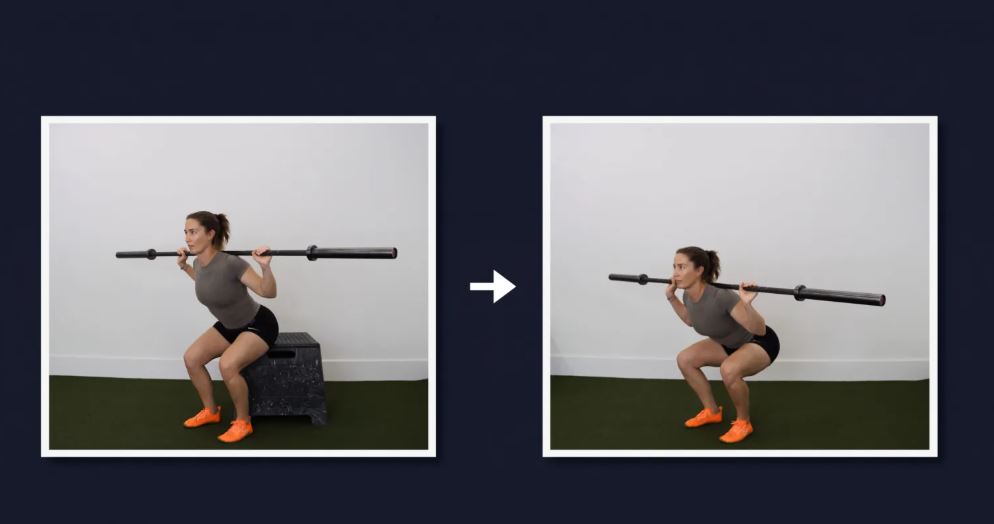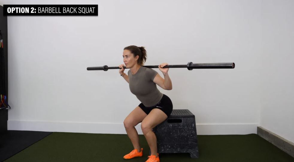 گزینه ۲: اسکات با هالتر از پشت - برای کاهش دامنه حرکتی خم شدن مفصل ران، با یک جعبه بالاتر شروع کنید.