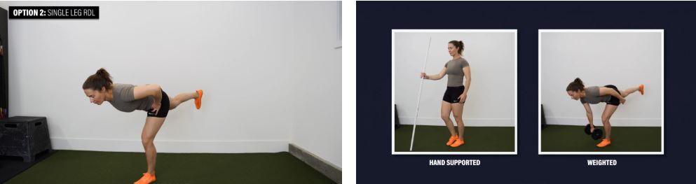گزینه ۲: RDL تک پا - همچنین میتوانید RDLهای تک پا را امتحان کنید که فشار را از طریق عضلات دورکننده لگن شما افزایش میدهد. میتوانید با نگه داشتن برای حفظ تعادل یا با کاهش عمق حرکت، این حرکت را آسانتر کنید. میتوانید با نگه داشتن وزنه، مانند دمبل یا کتلبل، آنها را سختتر کنید.