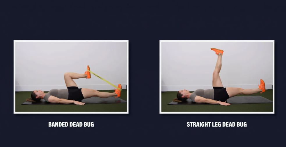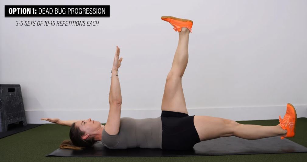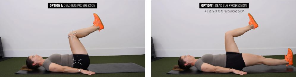 گزینه ۱: حرکت تدریجی Dead Bug - به پشت دراز بکشید و لگن و زانوهایتان را تا ۹۰ درجه خم کنید. به آرامی یک پا را صاف دراز کنید تا بالای زمین معلق بماند و سپس به حالت شروع برگردید. این حرکت را در سمت دیگر تکرار کنید و به طور متناوب ادامه دهید. این حرکت را تا ۳ تا ۵ ست ۱۰ تا ۱۵ تایی در هر طرف انجام دهید.