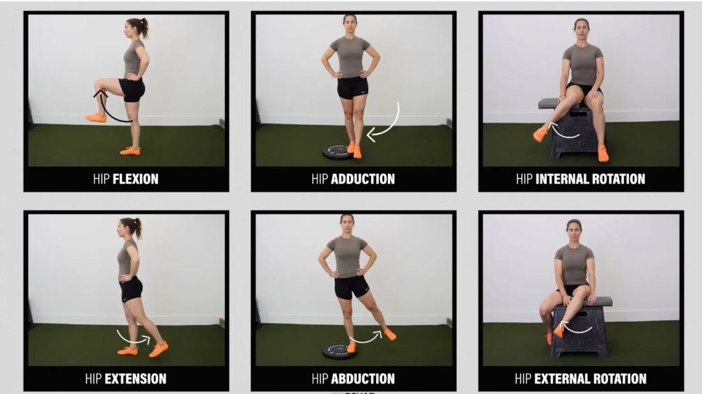 حرکات اصلی مفصل ران عبارتند از خم شدن(فلکشن)، باز شدن(اکستنشن)، نزدیک شدن(ادداکشن)، دور شدن (ابداکشن)، چرخش داخلی (اینترنال روتیشن) و چرخش خارجی (اکسترنال روتیشن).