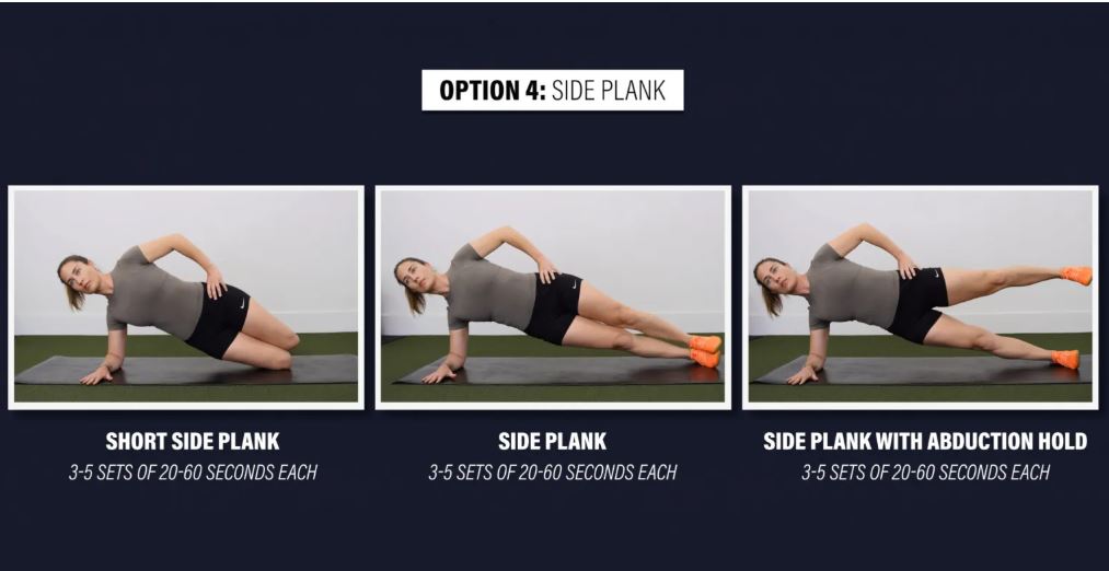 گزینه ۴: پلانک از پهلو - به پهلو دراز بکشید، پاهایتان را روی هم قرار دهید و ساعدتان را روی زمین بگذارید. باسن خود را بالا بیاورید و نگه دارید. اگر این حرکت برایتان خیلی سخت است، میتوانید با خم کردن زانوها و بلند کردن از آنجا به جای پاهایتان، یک پلانک از پهلو کوتاه انجام دهید. میتوانید با بلند کردن پای بالایی در موقعیت بالای پلانک، آن را سختتر کنید. این حرکت را تا ۳-۵ ست ۲۰ تا ۶۰ ثانیهای در هر طرف ادامه دهید.