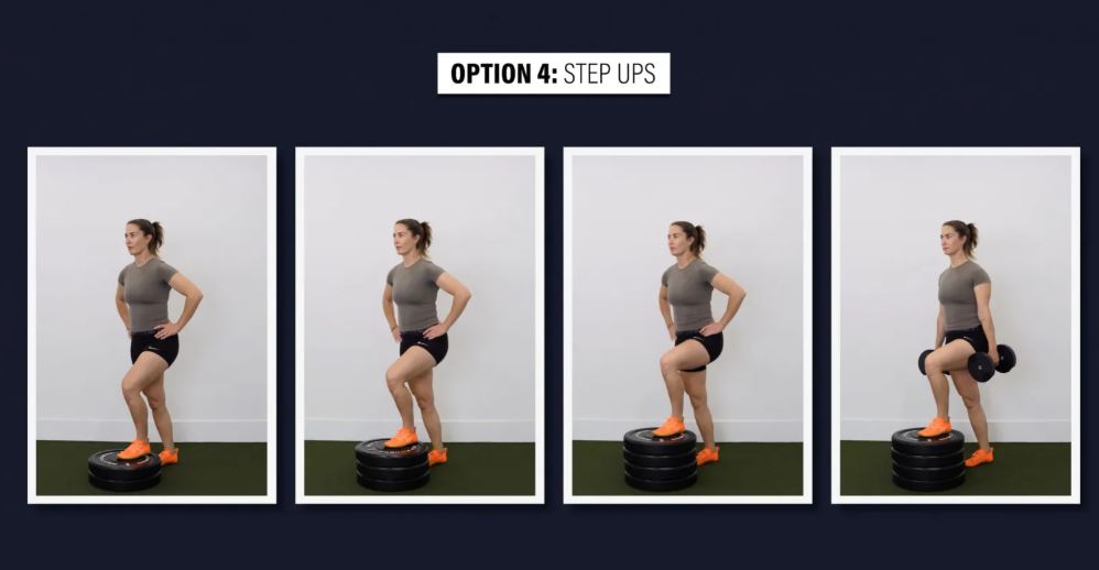 گزینه ۴: استپ آپ - با یک جعبه کوتاه شروع کنید و به تدریج ارتفاع آن را افزایش دهید. همچنین میتوانید با دمبل، کتلبل یا هالتر وزنه اضافه کنید.