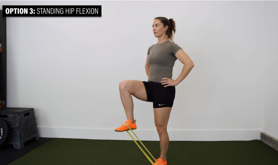 گزینه ۳: خم کردن لگن در حالت ایستاده - یک کش دور پاهایتان بیندازید و یک زانو را به سمت سینهتان بالا بیاورید، سپس آن را به حالت اولیه برگردانید و در طرف دیگر تکرار کنید. به طور متناوب و به تعداد دلخواه تکرار کنید.