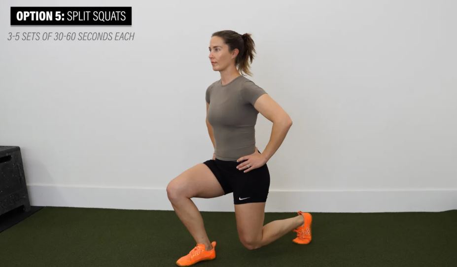 گزینه ۵: اسکات با اسپلیت - با اسکات ایزومتریک با اسپلیت شروع کنید، هدف ۳ تا ۵ ست ۳۰ تا ۶۰ ثانیهای برای هر طرف است.