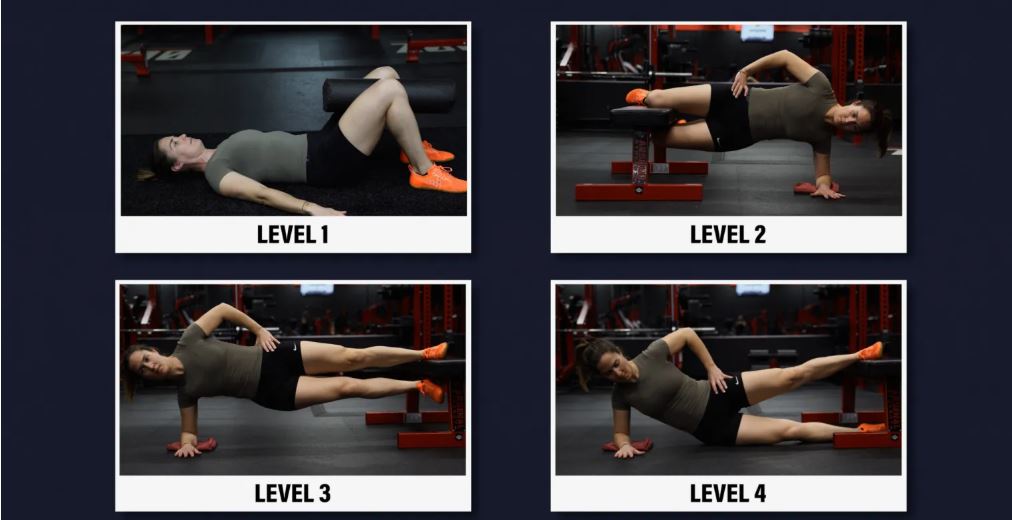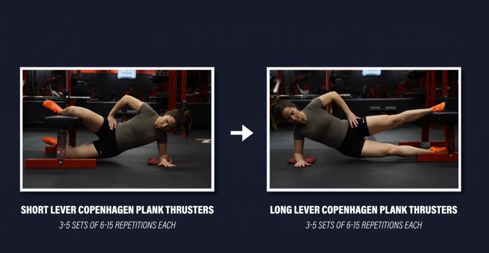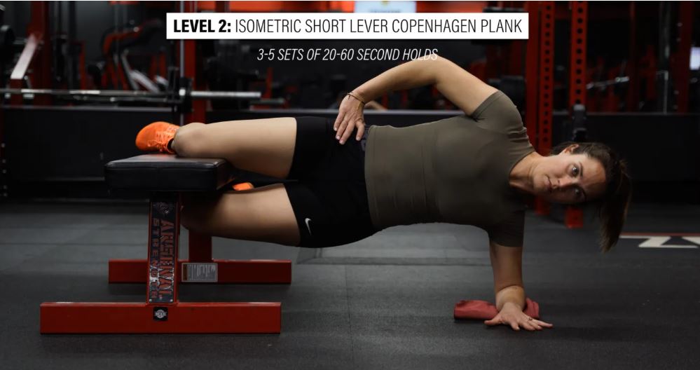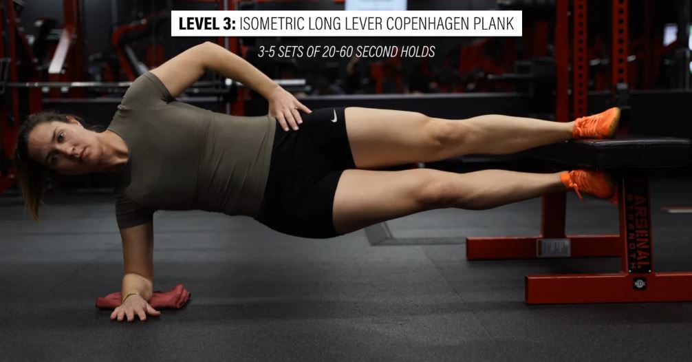 سطح ۳: پلانک ایزومتریک کپنهاگ با اهرم بلند - برای پیشرفت، کافیست از نیمکت فاصله بگیرید و مچ پای خود را به جای زانو روی آن قرار دهید. سعی کنید ۳ تا ۵ ست ۲۰ تا ۶۰ ثانیهای انجام دهید.