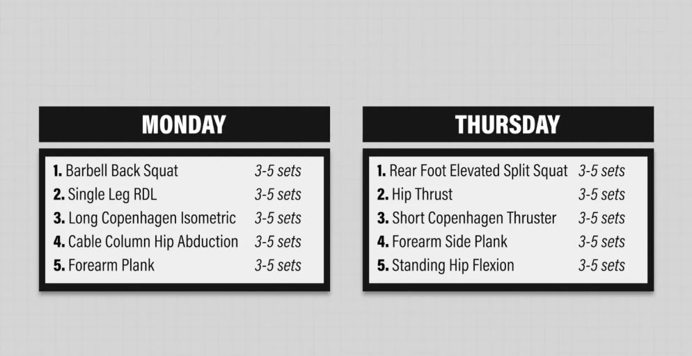 همانطور که قبلاً گفتم، اگر صرفاً به دنبال بازگشت به جلسات منظم باشگاه، دویدن، دوچرخهسواری، پیادهروی یا سایر فعالیتهایی هستید که شامل دویدن سریع، لگد زدن یا تغییر جهت نمیشوند، تعیین منبع درد کشاله ران و نقاط ضعف مرتبط با آن و انتخاب تمرینات موضعی خاص ممکن است برای شما کافی باشد. اگر این مورد در مورد شما صدق میکند، در اینجا یک برنامه نمونه وجود دارد که ممکن است مفید باشد: