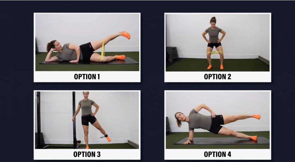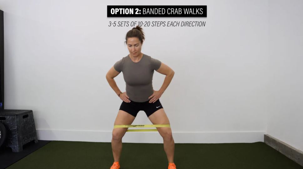 گزینه ۲: راه رفتن خرچنگی با باند - یک باند را درست بالای زانوهای خود قرار دهید و در حالت نیمه اسکات بایستید و پاهایتان رو به جلو باشد. قدمهای کوتاه به پهلو بردارید و در تمام مدت با فشار دادن زانوها به باند، تنش را در آن حفظ کنید. تا ۱۰ تا ۲۰ قدم در هر جهت حرکت کنید و ۳ تا ۵ ست تکرار کنید. اگر این حرکت خیلی آسان است، میتوانید با افزایش مقاومت باند یا قرار دادن باند از مچ پا، آن را چالشبرانگیزتر کنید.