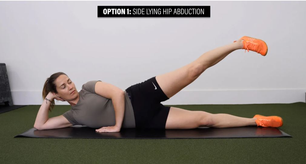 گزینه ۱: دور کردن مفصل ران از پهلو - به پهلو دراز بکشید و پای بالایی خود را به آرامی و با کنترل بالا و پایین ببرید.