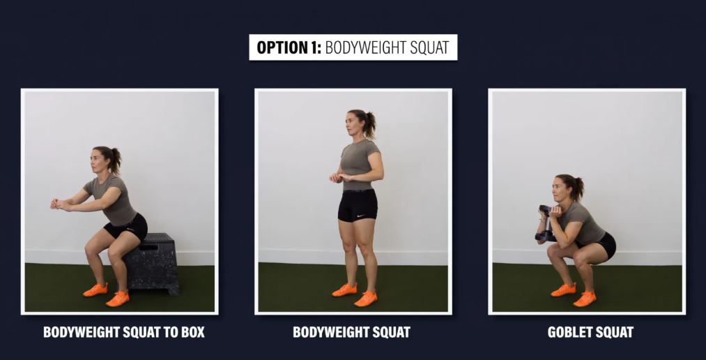 گزینه ۱: اسکات با وزن بدن - با انجام اسکات با وزن بدن شروع کنید. میتوانید با کاهش دامنه حرکتی با قرار دادن یک جعبه، این حرکت را آسانتر کنید، یا میتوانید با نگه داشتن یک دمبل یا کتلبل برای اسکات گابلت، آن را دشوارتر کنید.