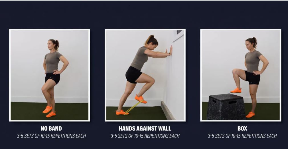 برای آسانتر کردن این حرکت، کش را بردارید یا کمی به جلو خم شوید و دستان خود را روی دیوار روبروی خود قرار دهید. برای چالشبرانگیزتر کردن حرکت، پای خود را تا بالای یک جعبه بلند بالا ببرید تا دامنه حرکت افزایش یابد یا مقاومت کش افزایش یابد. این حرکت را در ۳ تا ۵ ست ۱۰ تا ۱۵ تکراری در هر طرف انجام دهید.