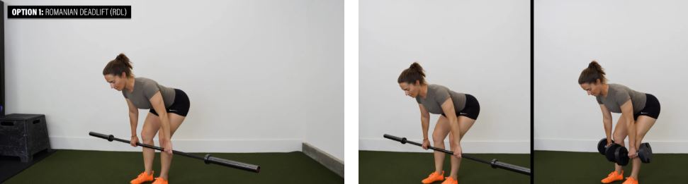 گزینه ۱: ددلیفت رومانیایی (RDL) - با یک RDL شروع کنید که از حالت ایستاده شروع میشود و با محدود کردن میزان خم شدن لگن، دامنه حرکت را قابل تحمل نگه دارید. میتوانید RDLها را با هالتر، دمبل یا کتلبل انجام دهید. در نهایت، سعی کنید دامنه حرکت خود را افزایش دهید تا بار بیشتری از طریق لگن خود اعمال کنید.