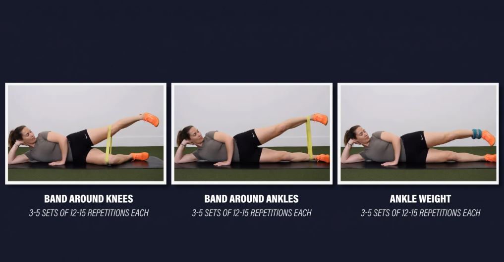 میتوانید با بستن یک کش به زانو یا مچ پا یا بستن وزنه به مچ پا، این حرکت را دشوارتر کنید. این حرکت را در ۳ تا ۵ ست ۱۲ تا ۱۵ تایی تکرار کنید.