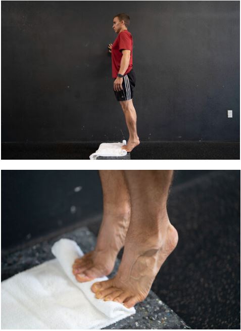 اولین توصیه ورزشی، یک تمرین منحصر به فرد برای بالا بردن پاشنه پا است که توسط راثلف و همکارانش در سال ۲۰۱۴ ارائه شد [22]. همانطور که در زیر نشان داده شده است، این تمرین شامل قرار دادن انگشتان پا روی یک حوله لوله شده و انجام بالا بردن پاشنه پا روی لبه یک پله با پشتیبانی سبک از دستان شما است. این تمرین باید با پای برهنه و با هدف حداکثر کشش فاسیای کف پا انجام شود.